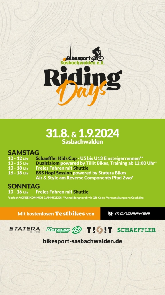 Endlich ist es soweit. Wenn auch klein und fein, aber die Riding Days sind am 31.08 & 01.09. Viel Program wird euch am 31.08 und 01.09 auf den Strecken vom BSS geboten.
